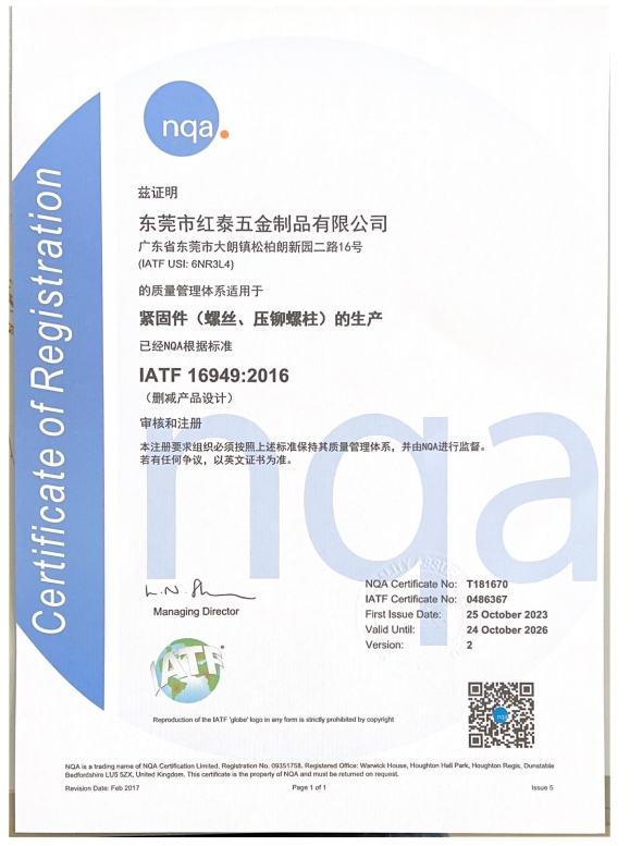 東莞市紅泰五金制品有限公司,公司占地六千多平方米,擁有五十多組螺絲機及六十臺自動車床設備。是一家專業設計、生產ISO、DIN、GB、JIS、ANSI、BS及客戶指定特殊要求的高精密五金緊固件的制造企業。